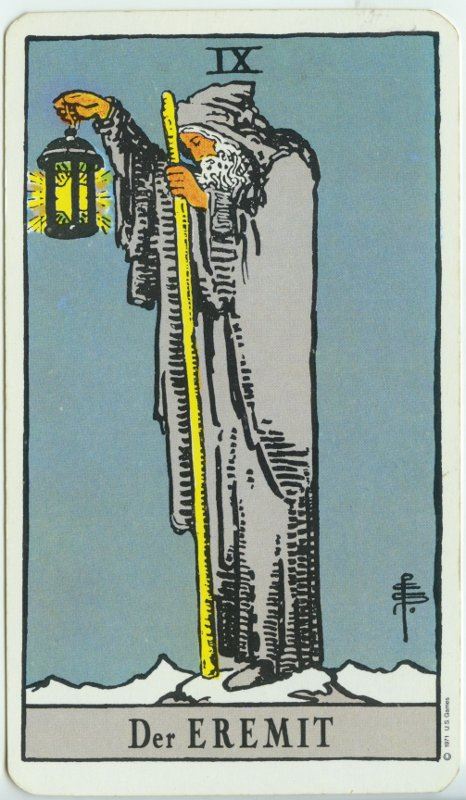 Karta prikazuje: Starac sijede brade, odjeven u skromnu, sivu odjeću, stoji mirno, uspravno, a ipak pognute glave. Starac je simbol životne mudrosti. Oslonjen je na štap, no izgleda kako nema namjeru krenuti na put. Oko njega je praznina, vanjski svijet ne postoji. Pustinjak je karta prožeta dubokim mirom i unutarnjim zadovoljstvom. Jedino što je važno nalazi se u nutrini, a ne u vanjskom svijetu.