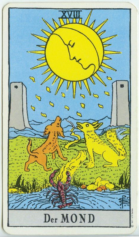 Karta prikazuje: Veliko i sjajno lice Mjeseca dominira središnjim dijelom neba, nadgledajući krajolik s dvjema sivim, nevelikim kulama koje, poput širokih vrata, otvaraju put u daljinu. Put počinje iz vode iz koje je upravo izašao rak, a tu su, na početku puta, pas i vuk. Voda je univerzalni simbol osjećaja i nesvjesnog.