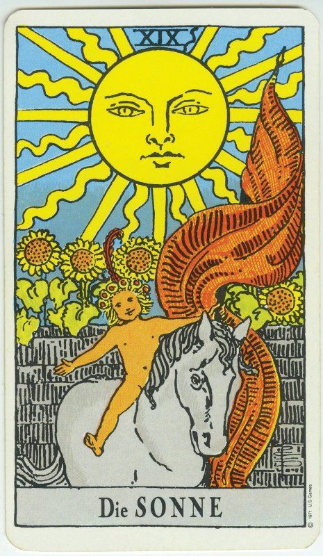 Poruke karte: Karta sunca proslava je života i svjetlosti. Podsjeća nas na to da svi u sebi imamo čistu i vedru, nedužnu dušu, zaigrano dijete koje se veseli životu. Sunce je neograničen izvor energije i vitalnosti, njegova svjetlost sjaji u našim srcima. Karta sunca naglašava važnost osobnog razvoja, potrage za svjetlošću.