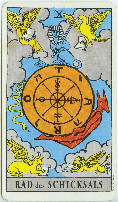 Karta prikazuje: Kolo sreće pridržava neobično biće. Ljudsko tijelo i pseća glava podsjećaju na egipatskog boga Anubisa, simbol inteligencije i mudrosti. Na vrhu sjedi Sfinga i postavlja zagonetke o tajnama života. Naoružana je mačem, simbolom oštrog, objektivnog uma. U kutovima su bik i lav, lako prepoznatljivi kao astrološki znakovi, dok orao simbolizira Škorpiona, a anđeo Vodenjaka.