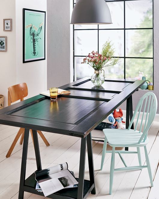 Očistite vrata od prašine, a zatim na njih prvo nanesite temeljni sloj bijele boje. Nakon toga kistom ili sprejem nanesite željenu nijansu. Na isti način obradite i dva drvena postolja. Slični modeli podesive visine mogu se kupiti i gotovi.