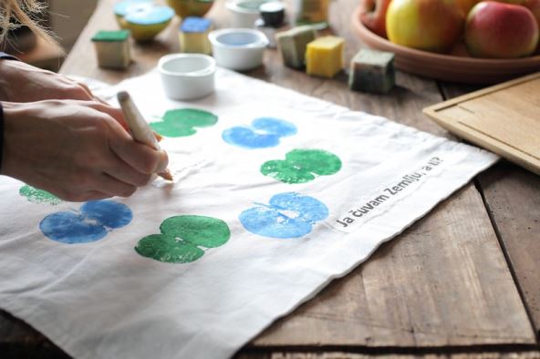 Na primjer, napravite platnenu torbu za odlazak na tržnicu ili čuvanje namirnica. Osnovni materijali potrebni za dekoriranje platnene torbe, ili čak majice ili stolnjaka, samo su dvije stvari – jabuka i boje za tkaninu. Odabrali smo jabuku zbog njenog prepoznatljivog presjeka i zato što asocira na prirodu, snagu, božansko, mudrost, a zelenu i plavu jer su to boje našeg planeta Zemlje.