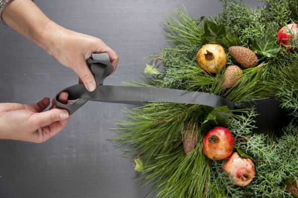 Napravite mašnu pa je oko čvora omotajte žicom, a zatim je, jednako kao i plodove, učvrstite na vijenac. Želite li dašak luksuza, srce mašne ukrasite elegantnim brošem. Ovisno o vratima na koja ćete postaviti vijenac, ukrasnu vrpcu na kojoj će on visjeti možete zavezati čvorom usko uz vijenac ili na samom kraju vrpce. I voilà – vijenac je spreman pozdraviti vaše prve susjede i goste.