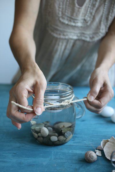 Poslažite kamenčiće na dno staklenke, ulijte vodu i u nju pažljivo stavite plutajuće svijeće pazeći da ne smočite fitilj. Svijeće ćete lakše zapaliti dugačkom šibicom ili štapićem. Kao ukrasni detalj dovoljno je omotati konopac oko ruba staklenke te na nju nalijepiti koji kamenčić ili školjku.