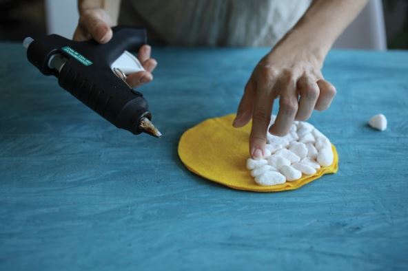 Uzmite okruglu zdjelu pa prema njoj izrežite materijal za podložak; ako koristite filc, rub možete označiti markerom te podložak izrezati škarama prema toj oznaci. Zagrijte vruće ljepilo pa na podlogu zalijepite kamenčiće. Nakon što se ljepilo ohladi, skuhajte si čaj ili kavu i iskušajte novi, „morski“ podmetač.