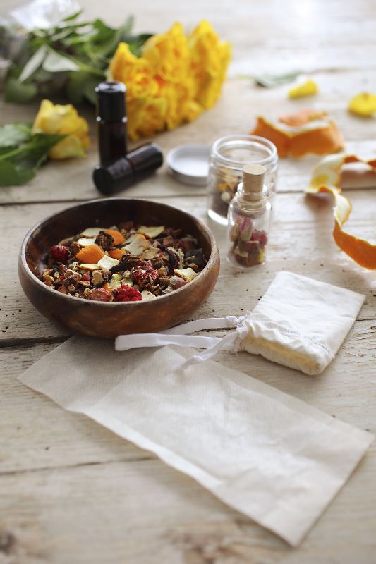 Sve što trebate je osušiti kore naranče, limuna, latice cvjetova mirisnog bilja te im dodati nekoliko kapi eteričnih ulja prema vlastitoj želji. Dodajte i cimet, šipak ili pak neki drugi plod. Povremeno ih protresite, odnosno promiješajte i dodajte još ulja ako miris oslabi. Željenom kombinacijom sastojaka možete napuniti filtar-vrećice za čaj ili ukrasne platnene vrećice i smjestiti ih u ormar, ladice s odjećom ili pod jastuk za ugodno mirisno iznenađenje.