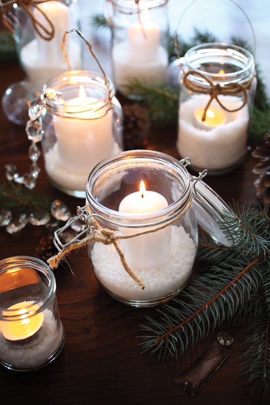 Oko ruba staklenki omotajte žicu u obruč i kliještima spojite krajeve. Učinite to labavo, da biste od dodatnog komada žice, koji ćete provući kroz obruč, mogli napraviti dršku, tj. ručke za nošenje lampiona. Tek nakon toga stegnite žicu kliještima. Uz to možete oko obruča omotati i malo konopčića ili rafije. U pripremljene staklenke naspite krupnu sol i stavite svijeće raznih veličina. Sol će biti odličan dekorativni element, ali i oslonac za podizanje lučica ili svijeća.