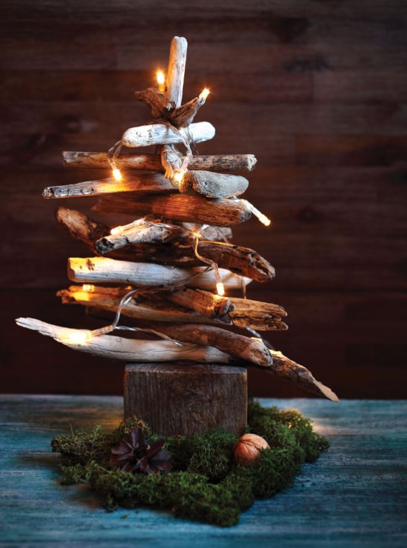 Pronađite komad drva u obliku kocke ili nekog drugog stabilnog oblika koji će biti postolje za drvce pa na njega, od najdužeg prema najkraćem, slažite naplavine ili grane. Lijepite ih na sredini „grančica“ te ih prilikom redanja rotirajte za oko 90 stupnjeva tako da dobijete malo božićno drvce koje možete okititi lampicama ili mini ukrasima.