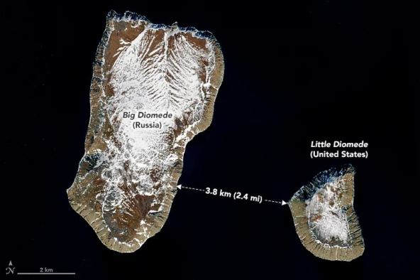 Ne samo da su ova dva otoka udaljena 3,8 kilometra u dvije različite države, već ih vremenski dijeli i 21 sat. Kad je u američkom Malom Diomedu četvrtak u podne, u Velikom Diomedu je petak i 9 sati ujutro.