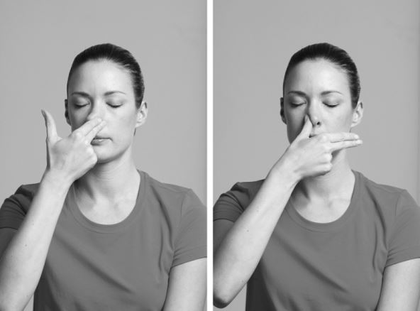 Zatvorite oči pa naizmjence dišite kroz lijevu pa desnu nosnicu. Desnim palcem zatvorite desnu nosnicu pa polako i duboko udahnite na lijevu, zatvorite je prstenjakom, polako dignite palac i izdahnite na desnu nosnicu. Zatim udahnite na desnu nosnicu, pa je zatvorite palcem i izdahnite na lijevu. Ponavljate nekoliko minuta koncentrirajući se na disanje.