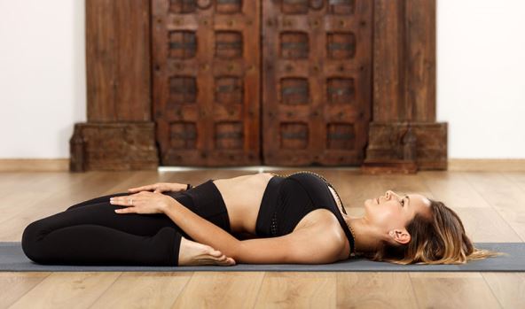 Kleknite na pod i sjednite na pete. Zatim pete lagano razmaknite i sjednite na pod, podbočite se rukama i polako se spuštajte na leđa. Pratite mogućnosti svojeg tijela. Oslonite se na laktove, a ako možete, lezite na leđa. Rukama iza glave obuhvatite laktove ili ih samo ispružite iznad glave. Produbite dah i dišite ravnomjerno. Udahom osjetite mišiće kako se istežu, a izdahom ih opustite.