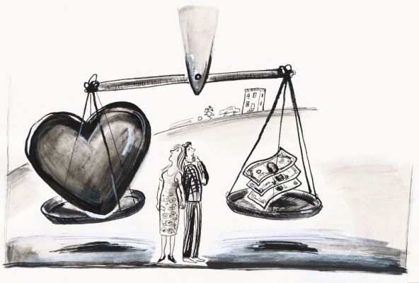 Muškarac i žena ulaze u odnos s različitim obiteljskim obrascima raspolaganja novcem i tu često dolazi do razmirica. Tko više troši i na što? Koliko tko pridonosi u zajedničku blagajnu? Neki parovi odmah na početku spoje sav novac i imovinu, pa ono što je bilo „moje“ i „tvoje“ postaje „naše“, dok drugi otpočetka paze da ne ostanu zakinuti pa svatko barata isključivo svojim novcem.
