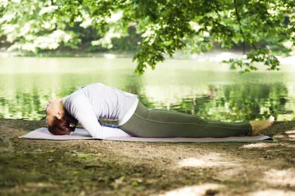 S udahom podižemo glavu, otvaramo prsni koš i spustimo glavu otraga. Bokovi ostaju što bliže podu, laktovi ostaju savijeni, ali ih držimo uz tijelo. Ramena spustimo dolje od ušiju. Zadržimo tri udaha i spustimo se na pod. Ponovimo tri puta. Opustimo tijelo ležeći potrbuške. Stavimo dlan na dlan ispred glave, jedno uho oslonimo na ruke. Opustimo cijelo tijelo.