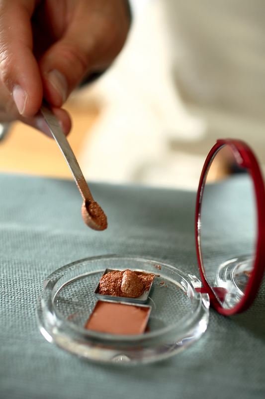 U staklenci zagrijte shea maslac i biljno ulje macerata aloe vere pa zatim dodajte talk, rižin puder i cinkov oksid (prethodno usitnjen u fini prah da se izbjegnu grudice). Postupno dodajte pigment za temelj (smeđi) i pigment za sjaj (smeđi). Naravno, boje tj. pigmente možete izabrati po svom ukusu.