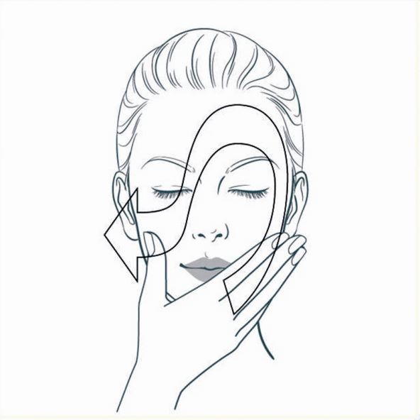 Nakon što vrhovima prstiju na lice nanesete kremu ili serum, laganim pritiskom dlana masirajte cijelo lice. Počnite od brade, preko korijena nosa prema vrhu čela pa sve do uha. Masirajte desnu stranu lica lijevom rukom, a lijevu stranu desnom rukom. Svaki postupak ponovite tri puta. Povlačenjem dlana prema gore potiče se cirkulacija i mikrocirkulacija što rezultira učvršćenjem kože obraza i brade.