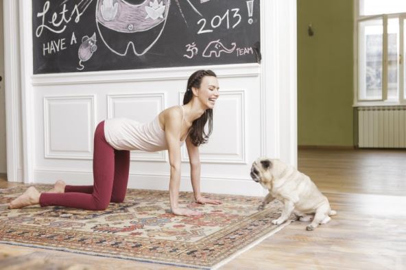 c) Pri dubokom izdisaju spustite trticu prema podu, glavu i bradu prema prsima i uvucite trbuh unutra. Na takav način kralježnica poprima oblik grbe, slično kako to rade mačke.