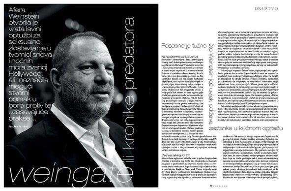 Prosinačko izdanje donosi i veliku priču o aferi Weinstein koja je potresla Hollywood, a na koju se osvrnula naša Ana Fazekaš. Nada Mirković se zapitala čiju sliku zapravo projiciramo na vlastitim društvenim mrežama, a naš urednik mode Saša Joka osvrnuo se na netom završenu hrvatsku modnu sezonu. Dotaknuli smo se i recentnih zbivanja na svjetskoj modnoj sceni pa vas u novom broju Ellea čekaju priče o Phoebe Philo, Driesu Van Notenu i Delpozu.