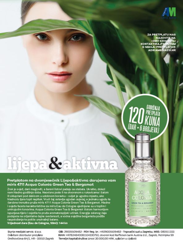 Cijena godišnje pretplate na magazin Lijepa&aktivna je 120 kuna, a obuhvaća 6 brojeva i dar - miris 4711 Acqua Colonia Green Tea & Bergamot. Vrijednost dara (Eau de Cologne, 50ml) iznosi 144 kune. Za detaljnije informacije o pretplati nazovite na +3851 6300 817 ili kontaktirajte putem maila na pretplata@adriamediazg.hr.