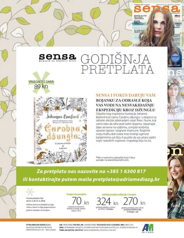 Pretplatnička ponuda vrijedi do 12. ožujka 2018. godine! Količina darova uz pretplatu ograničena je, stoga požurite. Iznos godišnje pretplate je 270 kuna, a uključuje 12 brojeva časopisa Sensa i dar – bojanka za odrasle Čarobna džungla. Vrijednost dara iznosi 89,00 kune.