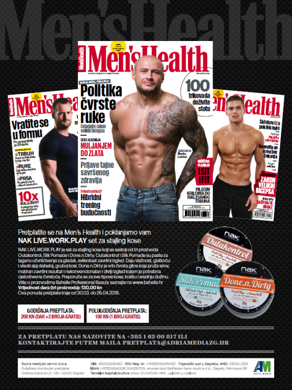 Iskoristite aktualnu ponudu godišnje pretplate na Men's Health do 27. travnja 2018. godine i poklonit ćemo vam NAK LIVE.WORK.PLAY set za stajling kose.
