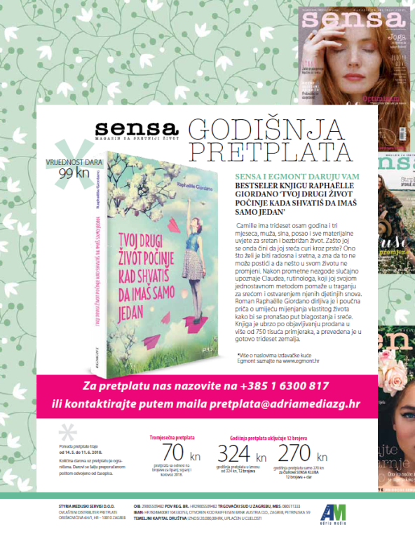Iskoristite aktualnu ponudu godišnje pretplate na magazin Sensa, pretplatite se i poklanjamo vam knjigu Tvoj drugi život počinje kada shva tiš da imaš samo jedan u vrijednosti od 99,00 kuna. Cijena godišnje pretplate iznosi 324,00 kune, a uključuje 12 brojeva i dar. Ponuda vrijedi do 11. lipnja 2018. godine.