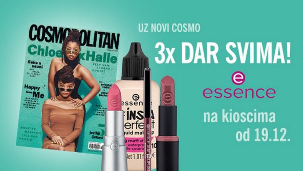 Stoga potražite novi Cosmopolitan s čak tri make up dara by essence, za sve čitatelje! Ruževi, sjajila za usne, sjenila, puderi, olovke za oči, lakovi za nokte by essence – čekaju vas na kioscima kao pokloni uz novi Cosmo, i to od 19. prosinca!