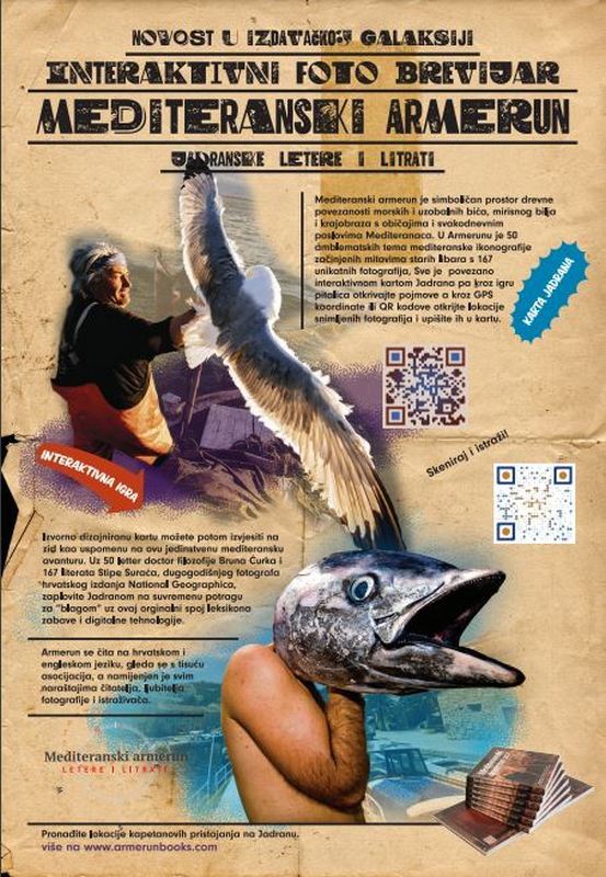 Mediteranski armerun je simboličan prostor drevne povezanosti morskih i uzobalnih bića, mirisnog bilja i krajobraza s običajima i svakodnevnim poslovima Mediteranaca. U Armerunu je 50 amblematskih tema mediteranske ikonografije začinjenih mitovima starih libara sa 167 unikatnih fotografija. Sve je povezano interaktivnom kartom Jadrana pa kroz igru pitalica otkrivajte pojmove, a kroz GPS koordinate ili QR kodove otkrijte lokacije snimljenih fotografija i upišite ih u kartu.