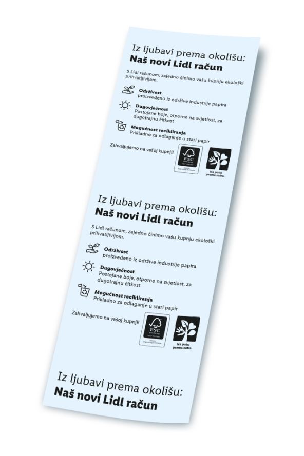 Inovativni, plavi termalni papir na kojem će se printati novi listići računa je FSC certificiran i dolazi iz odgovornog gospodarenja šumama. Listić računa se izrađuje bez razvijača kemijskih boja, otporan je na sunčevu svjetlost i može se trajno čuvati bez blijeđenja s obzirom da mu postojane boje omogućuju dugotrajnu čitkost. Još jedna prednost za kupce je ta što je Lidlov račun otporan na ulje i vodu te je stoga vrlo izdržljiv. Pogodan je za recikliranje pa se može sigurno odložiti u otpadni papir.
