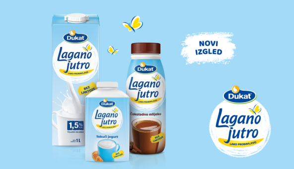 Vodeća linija mliječnih proizvoda bez laktoze Dukat Lagano jutro dostupna je u novom ruhu – u praktičnijem pakiranju novog vizualnog identiteta. Uz moderniji dizajn, omiljenu liniju svih ljubitelja mlijeka osjetljivih na laktozu sada čine i dva nova proizvoda: Dukat Lagano jutro mlijeko s 3,8 posto mliječne masti od jedne litre i Dukat Lagano jutro mlijeko s 1,5 posto mliječne masti od pola litre. Tako sada u bogatom okusu punomasnog mlijeka mogu uživati i oni intolerantni na laktozu*, dok će novo, manje pakiranje „klasika“ ove linije, Dukat Lagano jutro mlijeko s 1,5 posto mliječne masti, biti izvrstan odabir za brzu nadoknadu kalcija, bjelančevina i vitamina, bez nelagode.