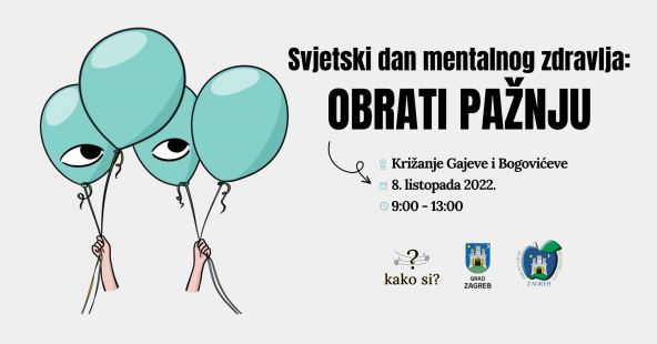 Obilježavanje Svjetskog dana mentalnog zdravlja organiziraju udruga kako si? i Grad Zagreb, Gradski ured za socijalnu zaštitu, zdravstvo, branitelje i osobe s invaliditetom ove subote, 8.10. od 9 do 13 sati u Bogovićevoj ulici u Zagrebu.