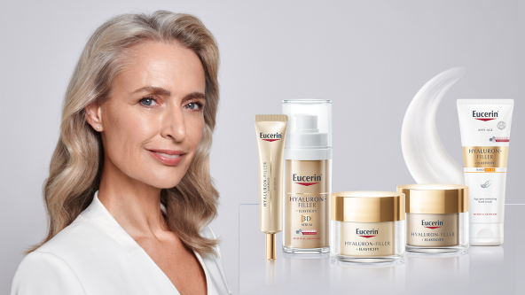 Kako starimo, koža prolazi kroz strukturne promjene. Gubi elastičnost i čvrstoću, a povećava se broj hiperpigmentacija i bora. Međutim pravovremenom i posebno formuliranom rutinom njege lica moguće je vidljivo poboljšati izgled kože bez obzira na godine. Eucerin – vodeći inovator unutar njege kože lica i tijela, predstavlja novu generaciju Hyaluron-Filler + Elasticity njege koja učinkovito biološki pomlađuje i revitalizira zrelu kožu pružajući joj blistav mladenački izgled.