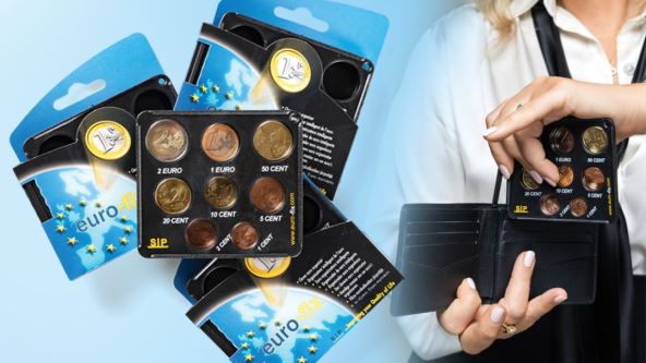 Zaboravite na dugotrajno i mukotrpno prebrojavanje eurokovanica! Uštedite vrijeme i živce pomoću praktičnog organizatora za sortiranje kovanica. U ovaj pametni novčanik stane točno 15,78 eura u apoenima od 2 i 1 euro te 50, 20, 10, 5, 2 i 1 cent. Držač je kvalitetne europske proizvodnje, a u upotrebi je od 2002. u cijeloj Europi.