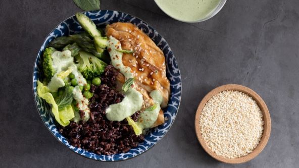 6. Podijelite Venere rižu, brokulu, šparoge, grašak i piletinu u zdjelice. Ukrasite listovima salate i mente, prelijte tahini umak i po želji dodajte malo čilija.