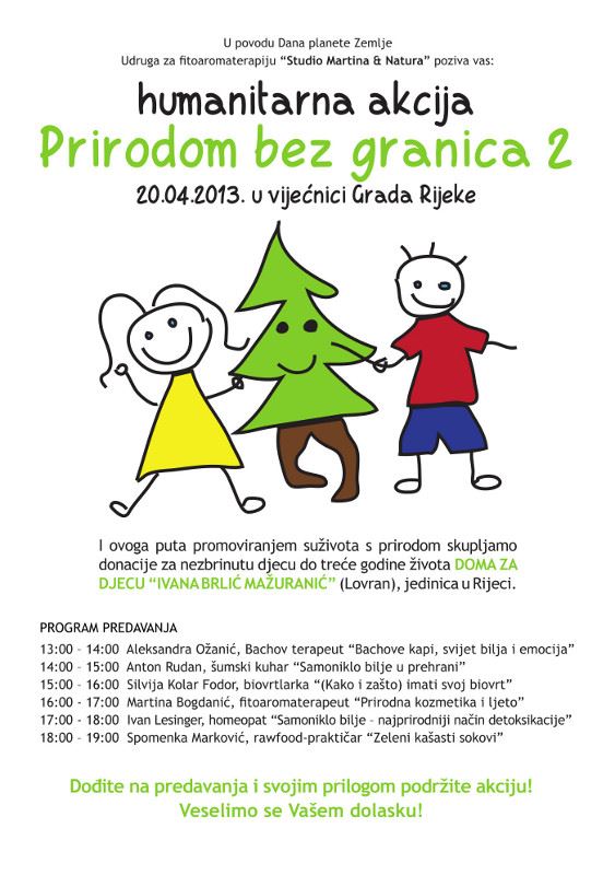 U povodu Dana planeta Zemlje Udruga za fitoaromaterapiju Studio Martina&natura poziva vas na humanitarnu akciju Prirodom bez granica II, koja će se održati u subotu 20. travnja u Gradskoj vijećnici (Korzo 40) u Rijeci. Tijekom popodneva skupina volontera akrilnim će bojama oslikavati platnene vrećice, a zainteresirani posjetitelji moći će ih kupiti za malu donaciju. Novac će se biti doniran nezbrinutoj djeci do treće godine života Doma za djecu Ivana Brlić Mažuranić u Lovranu.