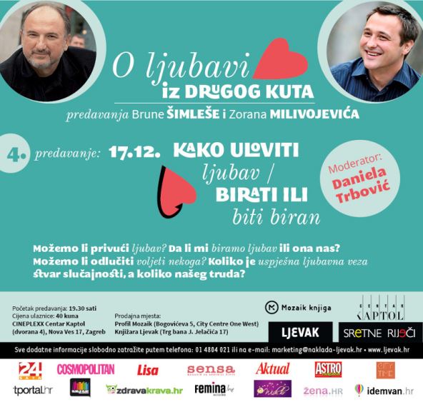 Predavanje Kako uloviti ljubav/Birati ili bitibiran održat će se u utorak, 17. 12. u 19.30 sati u CINEPLEXXU CENTAR KAPTOL (dvorana 4), Nova Ves 17, Zagreb