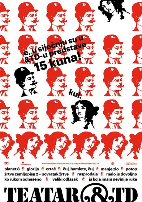 Zagrebački Teatar &TD još do kraja siječnja poziva na niz odličnih predstava po povoljnoj cijeni ulaznice od samo 15 kuna. Gledatelji imaju priliku pogledati, redom, „Veliki odlazak“ Zdenka Jelčića, „Gloriju“ Saše Božića, „Rasprodaju“ i „Potop“ Mirana Kurspahića, „Žrtve zemljopisa 2: povratak žrtve“M. Kurspahića i Rone Žulj, „Crtača“i „Manje zlo“kolektiva BADco., „Ja koja imam nevinije ruke“ Vesne Tominac Matačić, „Planet 8“ M. Ivičević, „Čuj, Hamlete, čuj“ Renate Carole Gatice, „Ko rukom odneseno“ Bobe Jelčića i „Malo je dovoljno“ Alena i Nenada Sinkauza te Aleksandra Stojkovića.