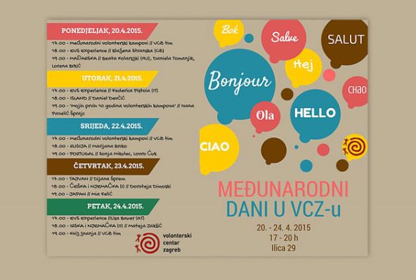 Program događanja održat će se u tjednu od 20. do 24. travnja, kada će VCZ ujedno obilježiti i Svjetski dan aktivizma mladih. Svakog dana, od 17 do 20 sati, u uredu VCZ-a u Ilici 29, bit će organizirane razne aktivnosti i radionice gdje će se svi prisutni moći pobliže upoznati s postojećim međunarodnim programima, čuti priče i dojmove volontera koji su sudjelovali na tim aktivnostima te saznati nešto više o zemljama iz našeg bližeg i daljeg susjedstva. Uz volontere, VCZ tim će svakodnevno biti na raspolaganju i zainteresiranim građanima odgovarati na sva pitanja vezana za međunarodno volontiranje.