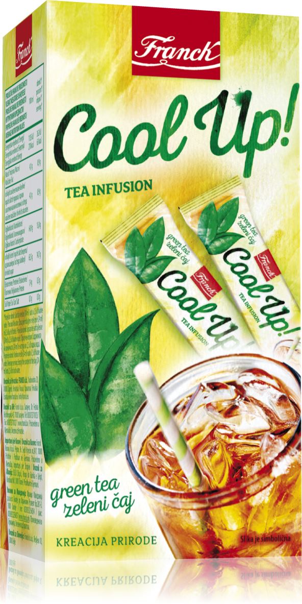 Franck Cool Up! dostupan je u tri okusa koji savršeno rashlađuju i gase žeđ: Pepermint, Zeleni čaj i Jabuka Mix. Dostupni su kao sirupi u pojedinačnim stick pakiranjima, koje se lako pomiješa s vodom i ledom, a moguće ih je piti samostalno ili pak kao bezalkoholne koktele sa svježim voćem.