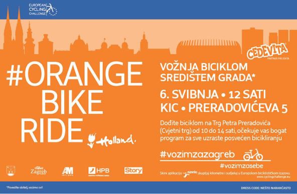 U organizaciji Kraljevine Nizozemske, Orange Bike Ride, promiče iste ciljeve kao i Europski biciklistički izazov. Nakon izvrsnog prošlogodišnjeg rezultata Zagreb se i ove godine od 1. do 31. svibnja natječe u Europskom biciklističkom izazovu sloganom Vozim za Zagreb, vozim za sebe!.Dodatnu notu cijelom projektu daje partner Hrvatska poštanska banka koja će za svaki prijeđeni kilometar u sklopu izazova donirati jednu kunu na tekući račun posebnih ambasadora ovogodišnjeg izazova, maturanata koji ove godine izlaze iz programa alternativne skrbi Dječjeg doma u Nazorovoj te počinju samostalni život. Za sudjelovanje u Europskom biciklističkom izazovu potrebno je skinuti novu besplatnu aplikaciju Naviki, a od 1. do 31. svibnja biciklirajući skupljamo kilometre za Zagreb i mlade Zagrepčane.