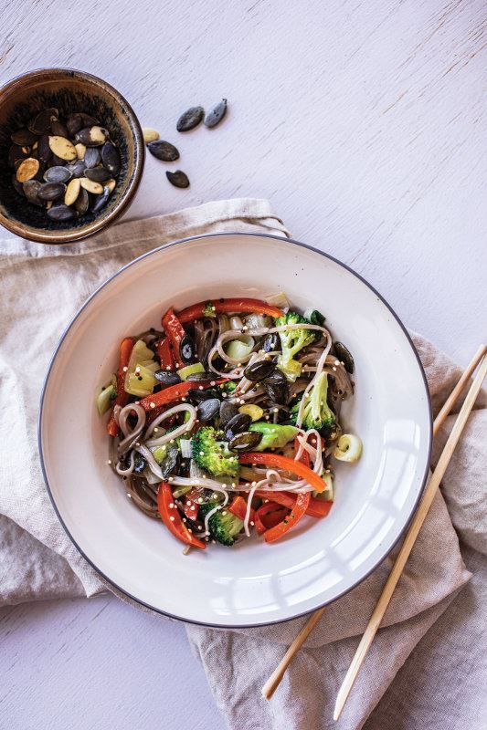 U posudu stavite đumbir i limunov sok te popaprite i dodajte povrće. Neka odleži 15 minuta. Zagrijte žlicu do dvije vode u woku, ubacite povrće te, brzo miješajući, kuhajte dok ne postane malo hrskavo. Na kraju dodajte kuhanu heljdu. Istresite na tanjur i prelijte hladno prešanim sezamovim ili bučinim uljem te povrće pospite bučinim i sezamovim sjemenkama.