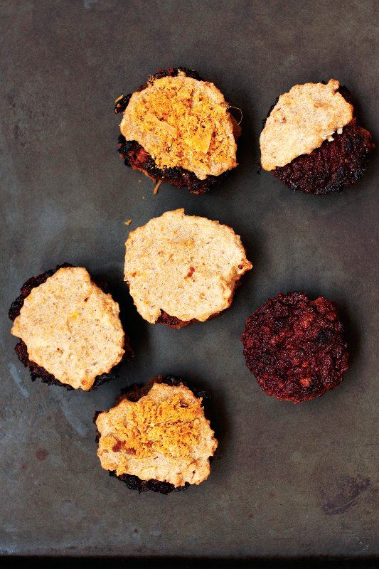 Za koru, ogulite zelenu plantana-bananu i narežite je na komade. U blender staviti plantana-bananu, aru-prah, češnjak, sol i vode prema potrebi. Izblendajte. Nakon 20 minuta pečenja izvadite kolačiće iz pećnice i po njima rasporedite smjesu iz blendera. Posipajte čvarcima. Vratite u pećnicu i pecite još 10 minuta na 160°C.