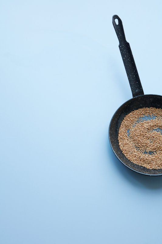 Stavite u sito dvije šalice sezamovih sjemenki u ljusci i operite svaku sjemenku pod mlazom hladne vode. Dobro osušene sjemenke stavite u tavu pa ih pržite na srednje jakoj vatri, neprestano ih miješajući drvenom žlicom. Kad ostaci vlage iz njih ispare, nastavite snažno miješati, pazeći da ne zagore.