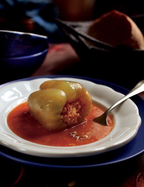 Operite i očistite paprike od koštica. Skuhajte bulgur s dvije šalice vode i prstohvatom soli. Pečeni tempeh razmrvite rukama. U posudi pomiješajte seitan, tempeh, bulgur, krupicu, brašno i začine (kajenski papar, muškatni oraščić, peršin i sol). Izmiješajte rukama. Dobiveni nadjev podijelite na osam jednakih dijelova i svakim napunite jednu papriku. U velikom loncu na maslinovom ulju popržite zobene pahuljice. Prelijte ih toplim temeljcem i rajčicom. Dodajte lovor i poslažite punjene paprike. Kuhajte poklopljeno na laganoj vatri 20 minuta. Dvije minute prije kraja dodajte shoyu i teryaki umak te umeboshi ocat.