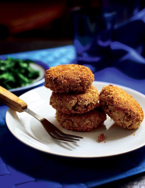 Narežite luk, propirjajte ga na maslinovu ulju i ostavite da se ohladi. Što sitnije narežite seitan i tofu. Pomiješajte rižu, luk, seitan, tofu, brašno, zobene pahuljice i začine (sol, papar, muškatni oraščić). Dobro izradite rukama. Od dobivene smjese oblikujte 10 popečaka i uvaljajte ih u mrvice. Pržite ih na vrućem suncokretovom ulju s obje strane pa izvadite na papirnati ubrus da se ocijede. Poslužite sa salatom od kupusa i pireom od crvene leće.