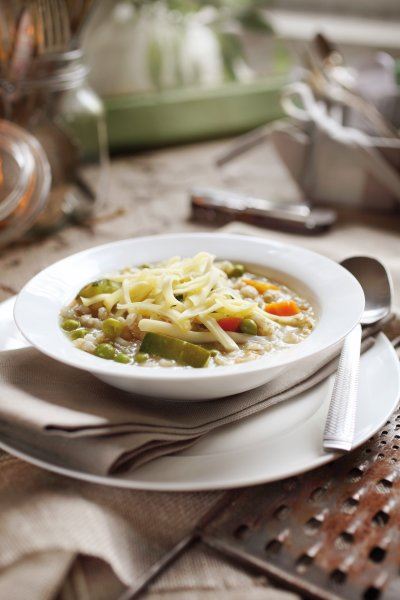 Na maslinovu ulju pirjajte sitno nasjeckani luk podlijevajući vodom nekoliko minuta. Dodajte grašak i nasjeckanu mrkvu pa na laganoj vatri pirjajte 15 minuta. Umiješajte tikvicu izrezanu na veće kocke i pirjajte još minutu-dvije. Dodajte prethodno opran i procijeđen ječam pa zalijte temeljcem i kuhajte 30 minuta. Potkraj kuhanja umutite žlicu rižina brašna ili škroba da se varivo malo zgusne. Kad je kuhano, poslužite u dubokom tanjuru i naribajte sir.
