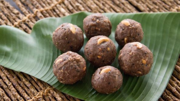 U širokoj tavi na laganoj vatri odvojeno popržite crni sezam, kikiriki i naribani kokos. Ostavite ih sa strane da se ohlade. Oljuštite kožicu s kikirikija. U tavi rastopite žlicu gheeja i na njemu minutu-dvije popržite bademe, pa i njih istresite na tanjur i ostavite sa strane. Zatim u tavu dodajte 2-3 žlice gheeja i proseno brašno. Pržite 15 do 20 minuta; pritom po potrebi dodajte još gheeja. Imajte na umu da će se u tavi tanjeg dna brašno brže popržiti. Često miješajte kako bi se brašno popržilo ravnomjerno. Kušajte da biste bili sigurni da nije ostalo sirovo. Dodajte popržene bademe, kikiriki, kokos i crni sezam neprestano miješajući. Umiješajte i šećer kokosove palme i kardamom u prahu te miješajte još 2 minute. Maknite s vatre i ostavite da se ohladi. Dlanove premažite gheejem pa oblikujte kuglice od 3-4 žlice smjese. Ako je potrebno, dodajte još gheeja kako biste mogli oblikovati čvrst i okrugao ladoo.