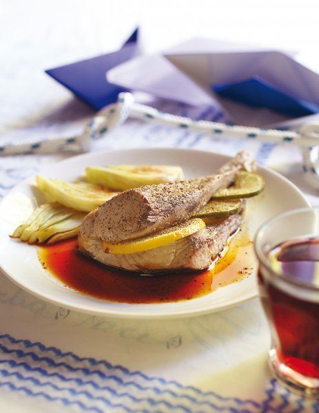 Komorač narežite na ploške i ispecite na gril tavi s obje strane. Prelijte maslinovim uljem i umeboshi octom pa ostavite poklopljeno 15-ak minuta da odstoji. Svaki filet tune prepolovite po dužini, posolite i umetnite 2-3 koluta limuna. U posudi zagrijte vodu visine 2 cm i stavite parilicu na koju ćete položiti filete s limunom. Parite 15-20 minuta. Prelijte tamari umakom i poslužite uz grilani komorač.