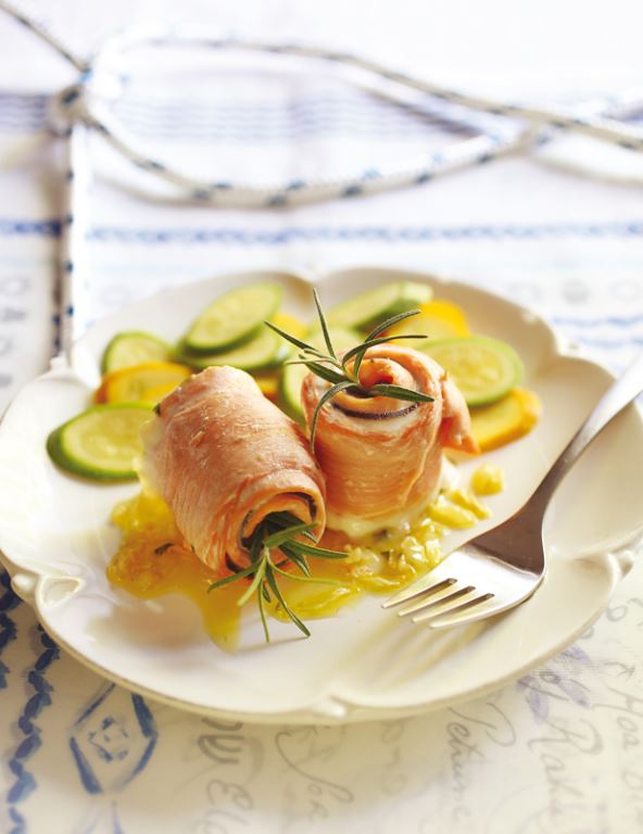 Na filete lososa poslažite tanke ploške tofua i sve zajedno zavijte u smotuljak. Pričvrstite polovicom čačkalice. U sredinu smotuljka stavite grančicu ružmarina. Na dno glinene posude stavite vodu i suncokretovo ulje pa položite smotuljke. Zagrijte pećnicu na 200 °C, poklopite i pecite 10-15 min. Još topao, svaki smotuljak prelijte žličicom maslinova ulja. Tikvice kuhane na pari bit će izvrstan prilog uz ovo jelo!