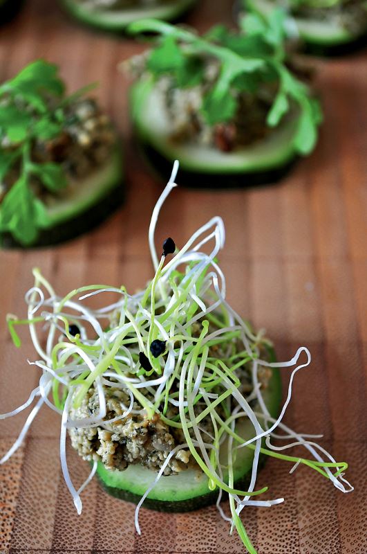 4. Na kolutove tikvica stavite žličicu namaza od sjemenki i ukrasite s malo klica. Ponovite dok ne potrošite sve tikvice.