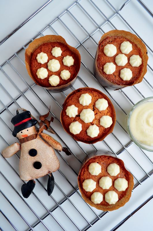 Na ohlađene tortice žlicom (ili špricom za ukrašavanje) nanesite malo kreme pa prije posluživanja pospite s malo cimeta. Ako vam ostane kreme od oraščića, čuvajte je u hladnjaku i iskoristite u roku od nekoliko dana.